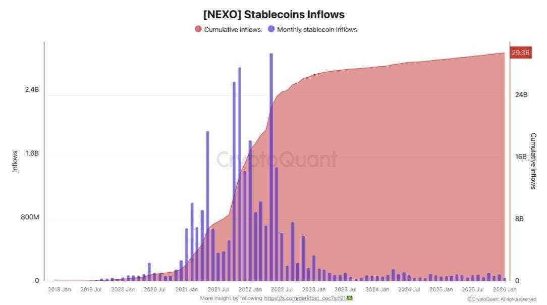 Nexo saw sustained $2B+ monthly stablecoin inflows back in 2021–22, cooled during 2023, but never really lost usage.